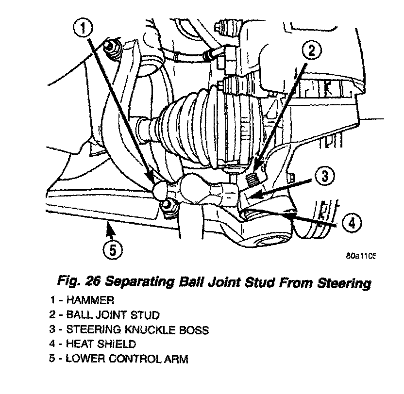 9. Turn steering knuckle so the front of the steering knuckle is facing as far outboard in the wheel well as possible. Using a hammer strike the boss on the steering knuckle, until the steering knuckle separates from the stud of lower ball joint.