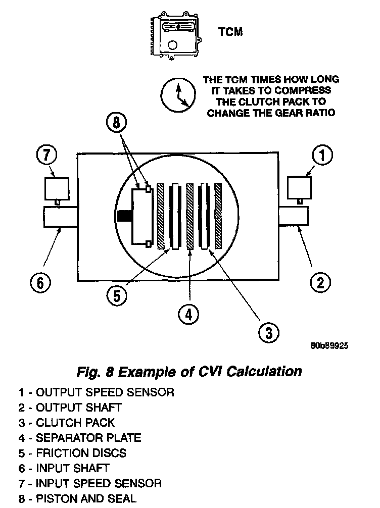 By comparing the two inputs, the TCM can determine transaxle gear ratio. This is important to the CVI calculation because the TCM determines CVIs by monitoring how long it takes for a gear change to occur (Fig. 8).