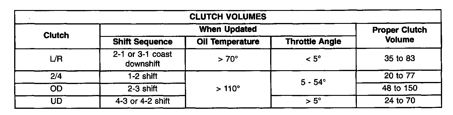 Certain mechanical problems within the clutch assemblies (broken return springs, out of position snap rings, excessive clutch pack clearance, improper assembly, etc.) can cause inadequate or out-of-range clutch volumes. Also, defective Input/Output Speed Sensors and wiring can cause these conditions. The following chart identifies the appropriate clutch volumes and when they are monitored/updated: