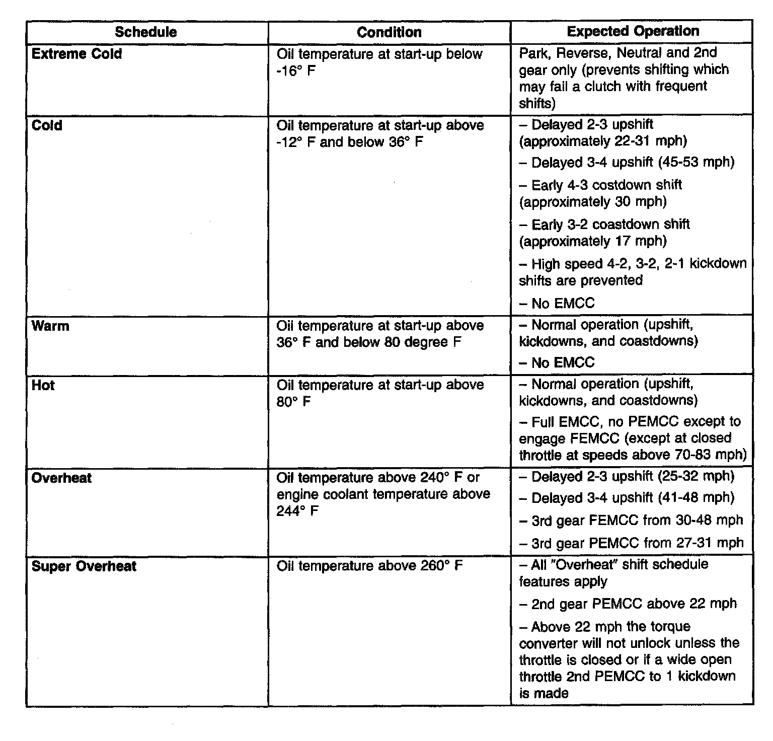 As driving conditions change, the TCM appropriately adjusts the shift schedule. Refer to the following chart to determine the appropriate operation expected, depending on driving conditions.