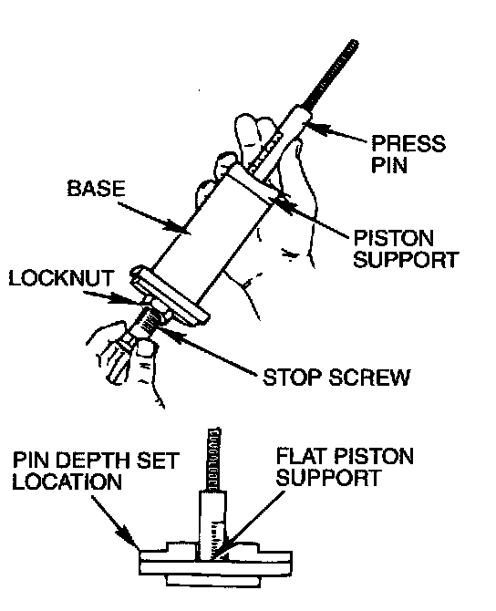 1. Thread the stop screw and lock nut assembly into the base. Fit the correct piston support on top of the base. Insert the press pin, threaded end up, into the hole in the piston support until the press pin touches the stop screw.