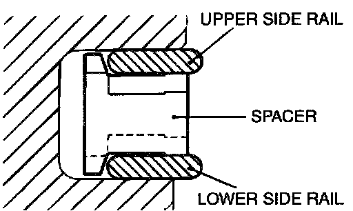 2. Install the upper side rail. To install the side rail, first fit one end of the rail into the piston groove, then press the remaining portion into position by finger. See illustration.