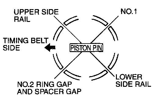 2. Arrange the piston ring and oil ring gaps (side rail and spacer) as shown in the illustration.
