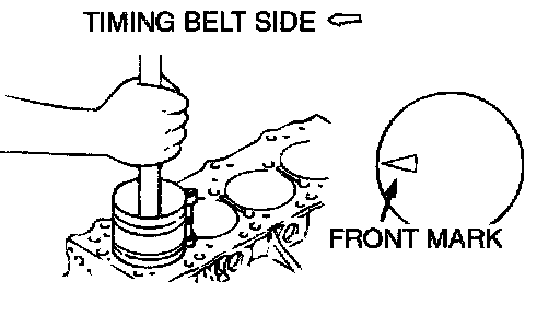 5. Insert the piston and connecting rod assembly into the cylinder with front mark on the piston crown pointing to the timing belt side.