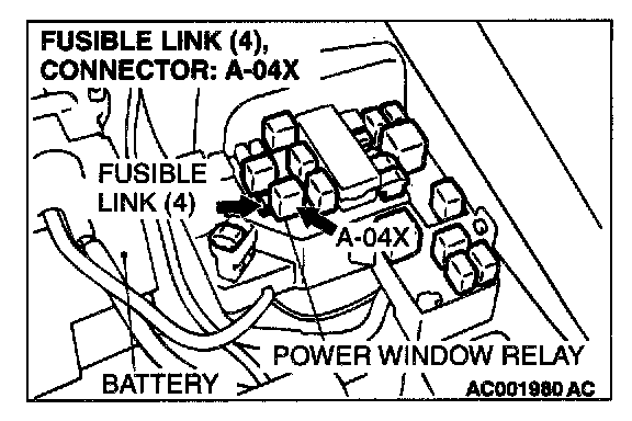 STEP 4. Check the harness wire between power window relay connector A-04X and fusible link (4).