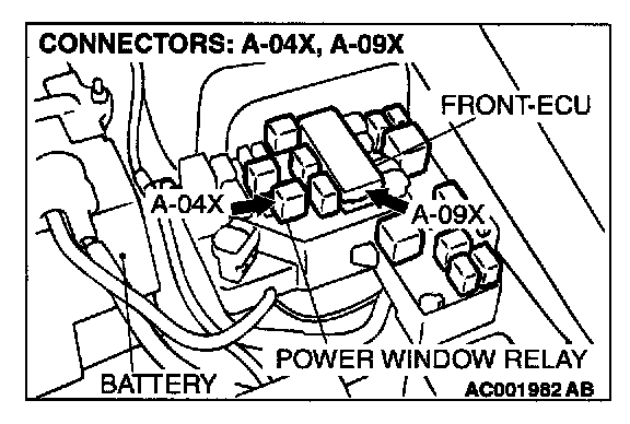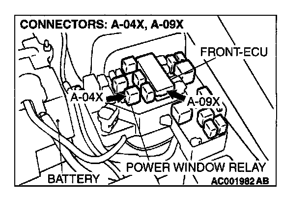 STEP 8. Check the power window relay connector A-04X and front-ECU connector A-09X for damage.