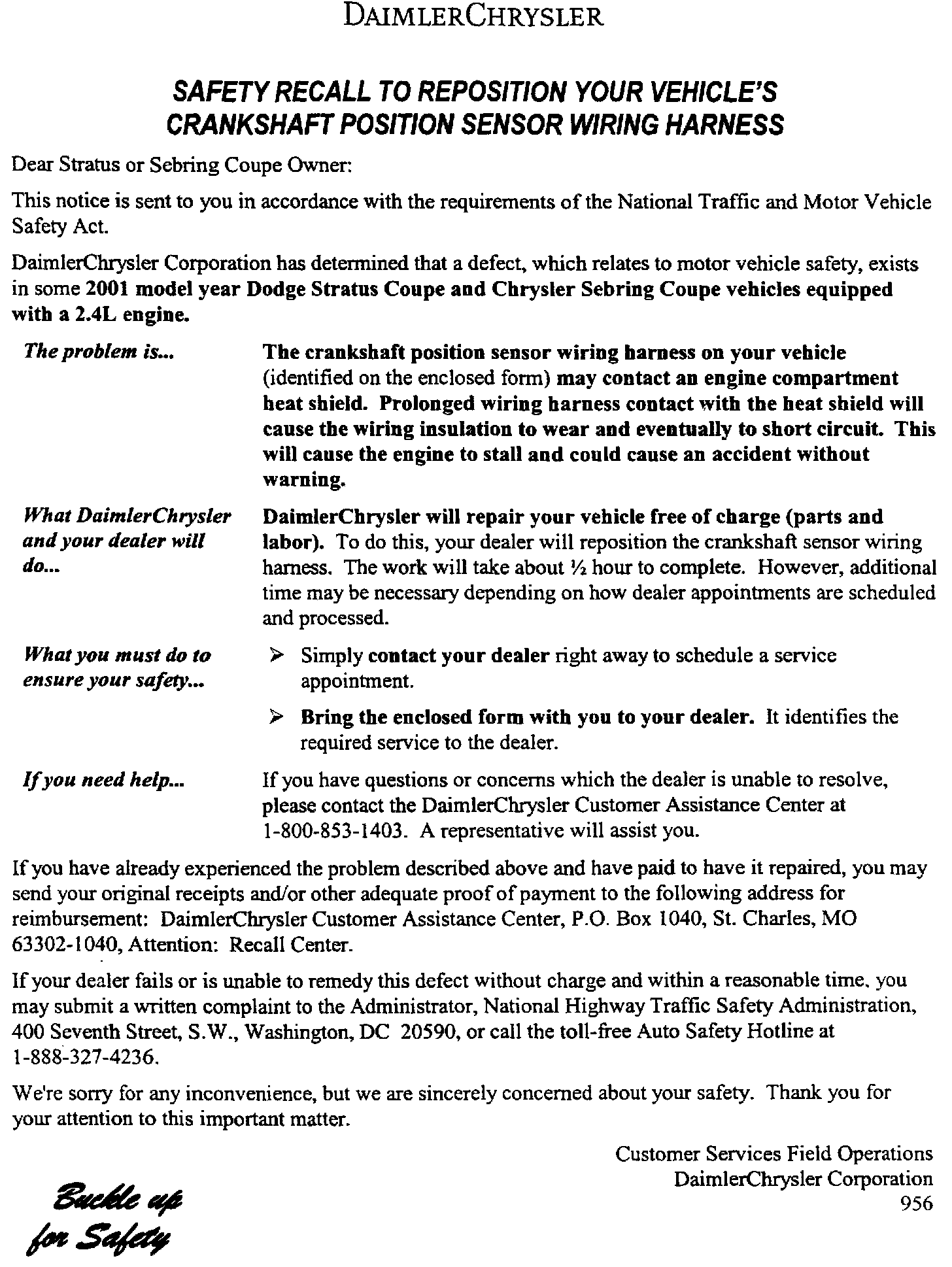Recall - Crankshaft Position Sensor Harness, Shorting