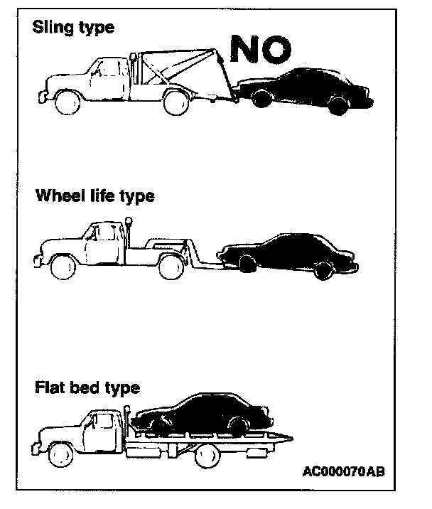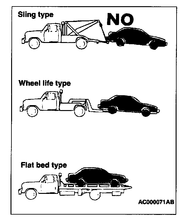 - This vehicle cannot be towed by a wrecker using sling- type equipment to prevent the lower arm from deformation. If this vehicle is towed, use a wheel lift or flat bed equipment.