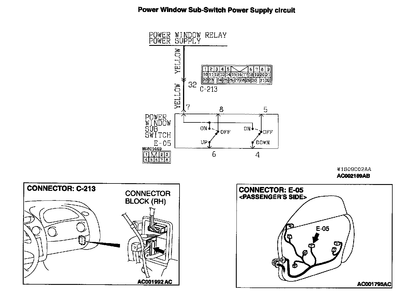STEP 2. Check the harness wires between power window sub-switch connector E-05 and connector block connector C-213.