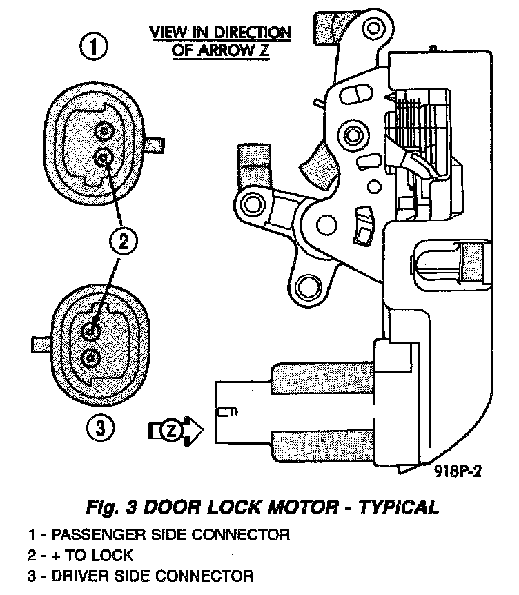 To test an individual door lock motor, disconnect the electrical connector from the motor. To lock the door, connect a 12 volt power source to the positive pin of the lock motor and a ground wire to the other pin. To unlock the door reverse the wire connections at the motor pin terminals. If these results are NOT obtained, replace the motor.