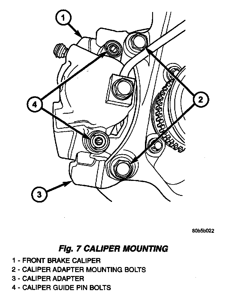 7. Carefully position the brake caliper over the brake rotor and adapter.