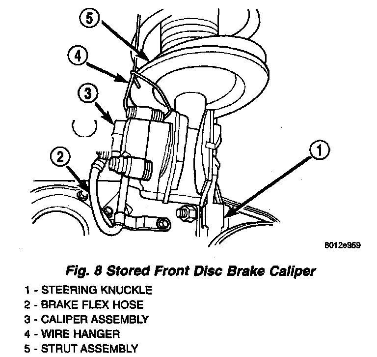 7. Using wire or cord, hang the caliper from the front strut assembly. Support the caliper firmly to prevent weight of caliper from being supported by the brake fluid hose.