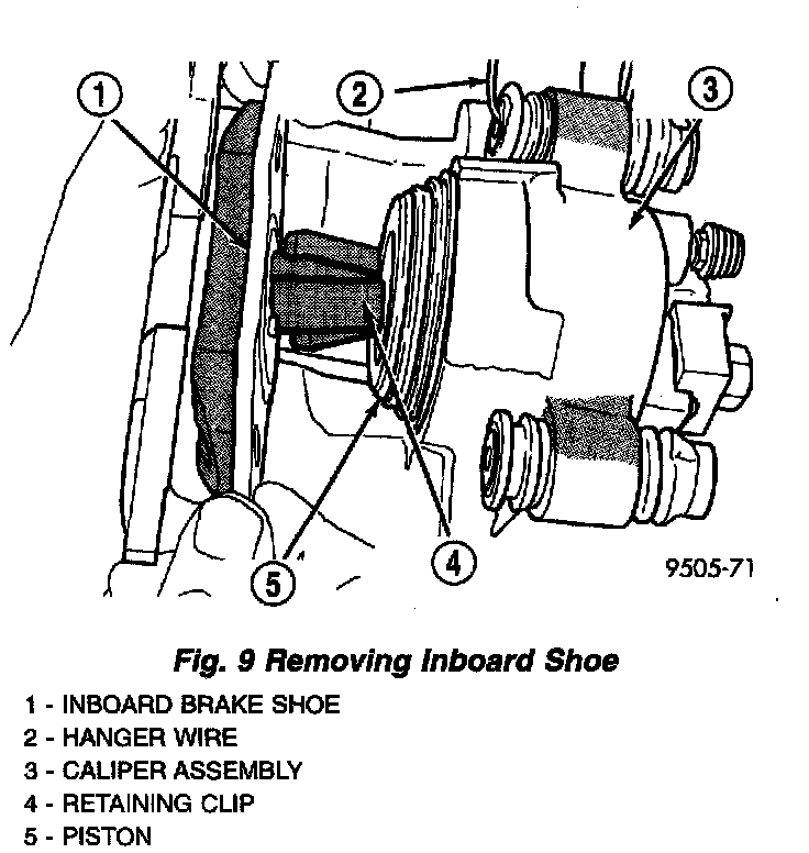 9. Pull the inboard brake shoe away from the caliper piston until the retaining clip on shoe is free from the cavity in the caliper piston.