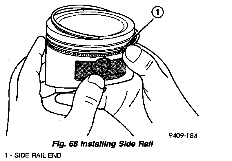 2. Install the side rail by placing one end between the piston ring groove and the expander. Hold end firmly and press down the portion to be installed until side rail is in position. Do not use a piston ring expander (Fig. 68).