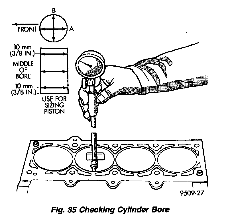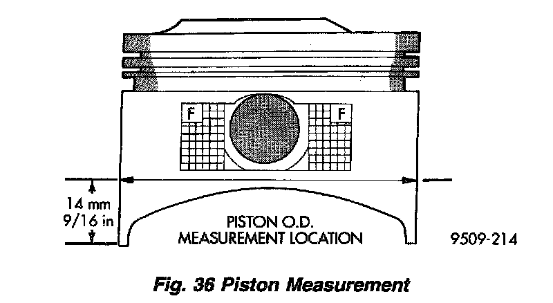 PISTON TO CYLINDER BORE FITTINGPiston and cylinder wall must be clean and dry. Piston diameter should be measured 90 degrees to piston pin about 14 mm (9/16 inch) from the bottom of the skirt as shown in (Fig. 36). Cylinder bores should be measured halfway down the cylinder bore and transverse to the engine crankshaft center line shown in (Fig. 35). Refer to Specifications. Correct piston to bore clearance must be established in order to assure quiet and economical operation.