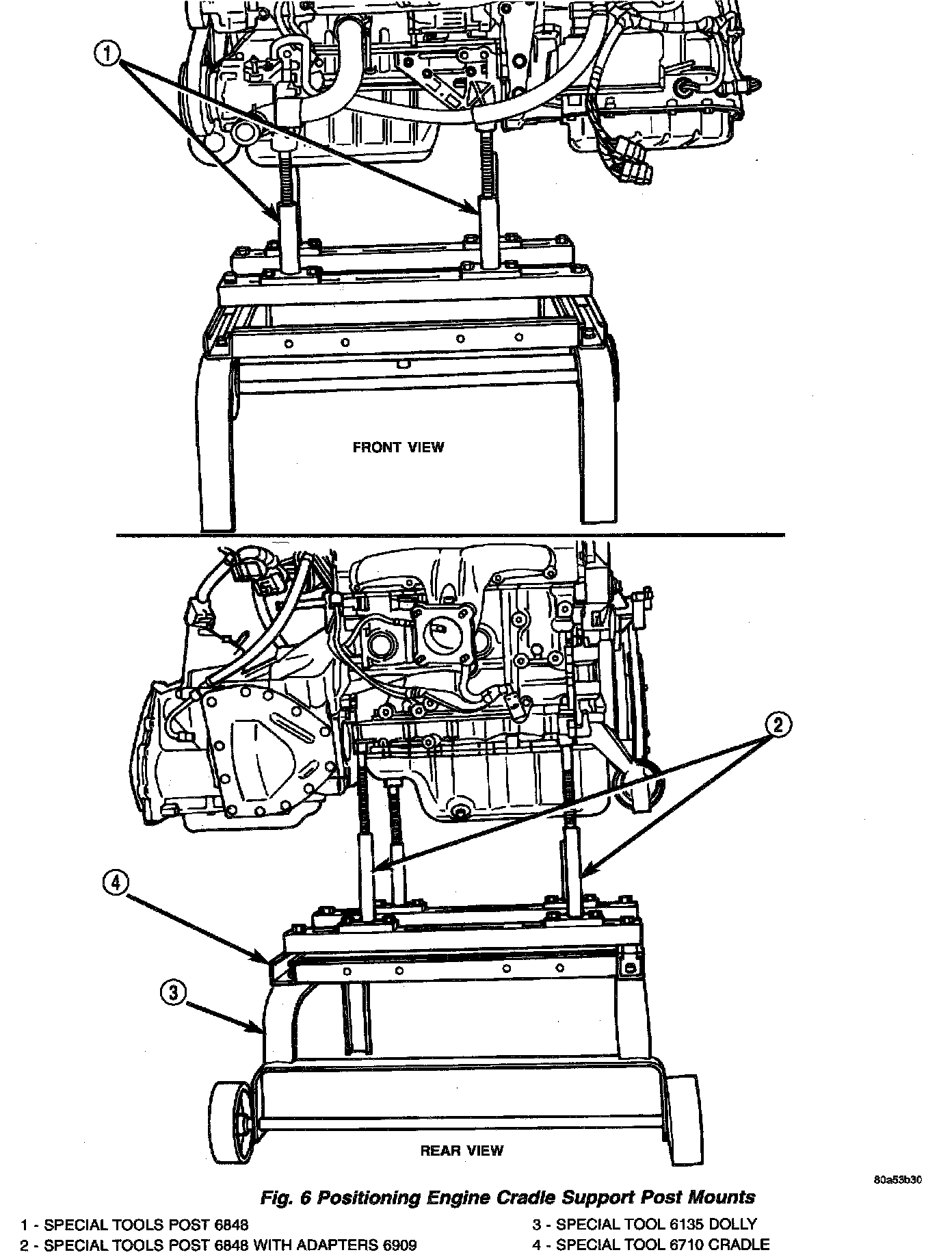 41. Raise vehicle enough to allow engine dolly 6135 and cradle 6710 with posts 6848 to be installed under vehicle (Fig. 6).