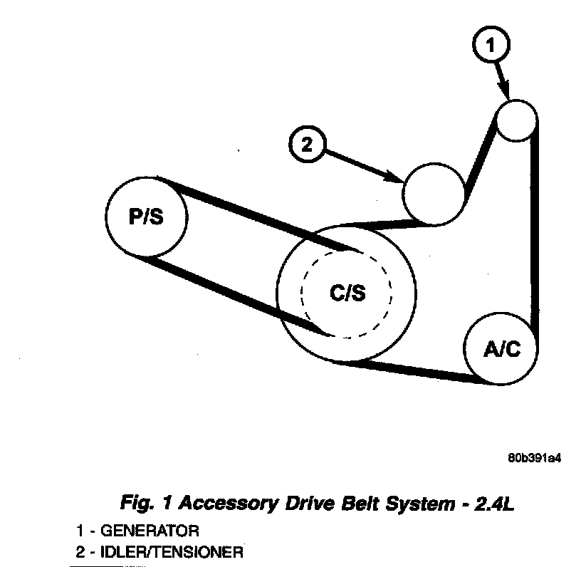 The accessory drive consist of two Poly-V type belts (Fig. 1) or (Fig. 2). One belt drives the power steering pump, the other drives the generator and air conditioning compressor. Both belts on the 2.7L engine are manually tensioned. The power steering belt on the 2.4L engine is manually tensioned. The air conditioning/generator belt on the 2.4L engine has an automatic belt tensioner.
