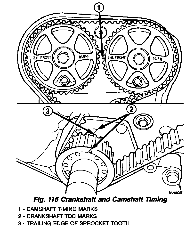 2. Set camshafts timing marks so that the exhaust camshaft sprocket is a 1/2 notch below the intake camshaft sprocket (Fig. 120).