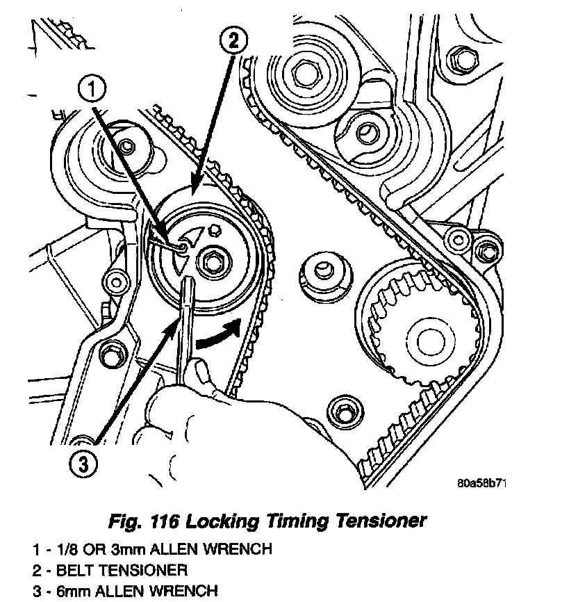 13. Install 6 mm Allen wrench into belt tensioner. Before rotating the tensioner, insert the long end of a 1/8" or 3 mm Allen wrench into the pin hole on the front of the tensioner (Fig. 116). While rotating the tensioner counterclockwise, push in lightly on the 1/8" or 3 mm Allen wrench, until it slides into the locking hole.
