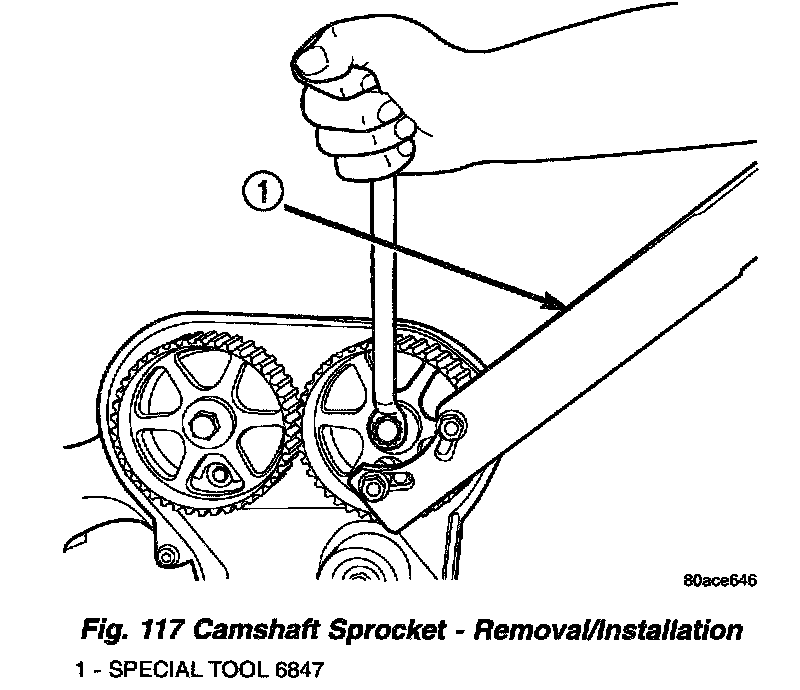 3. Hold camshaft sprockets with Special Tool 6847 while removing center bolts (Fig. 117).
