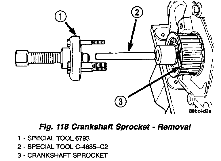 3. Remove crankshaft sprocket using Special Tools 6793 and C-4685-C2 (Fig. 118).
