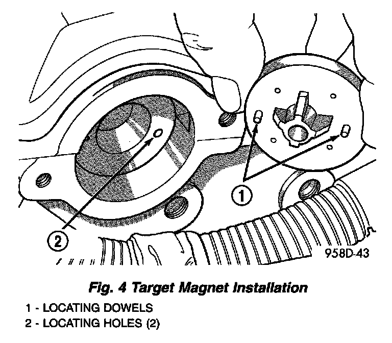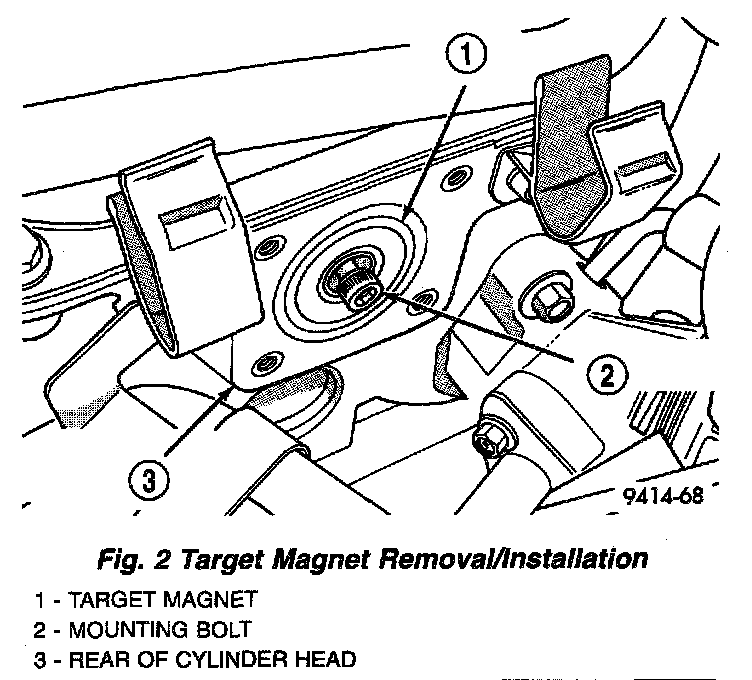 1. Install target magnet in end of camshaft. Tighten mounting screw to 3 Nm (30 in. lbs.) torque. Over torqueing could cause cracks in magnet. If magnet cracks replace it.