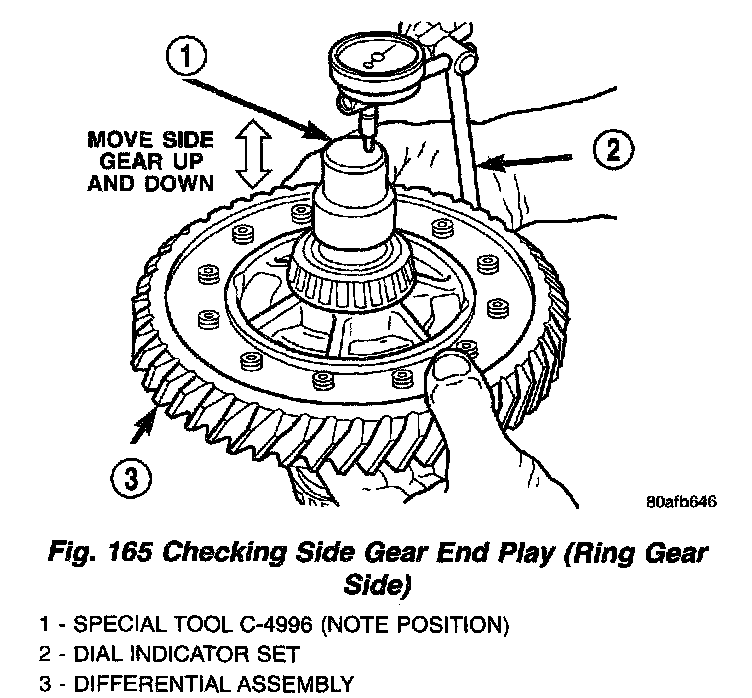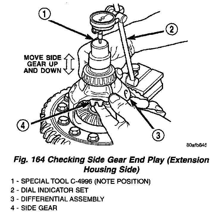 5. Set up dial indicator set C-3339 and tool C-4996 as shown in (Fig. 164) (Fig. 165) to measure side gear end play. Side gear end play must be within 0.001 - 0.013 inch.