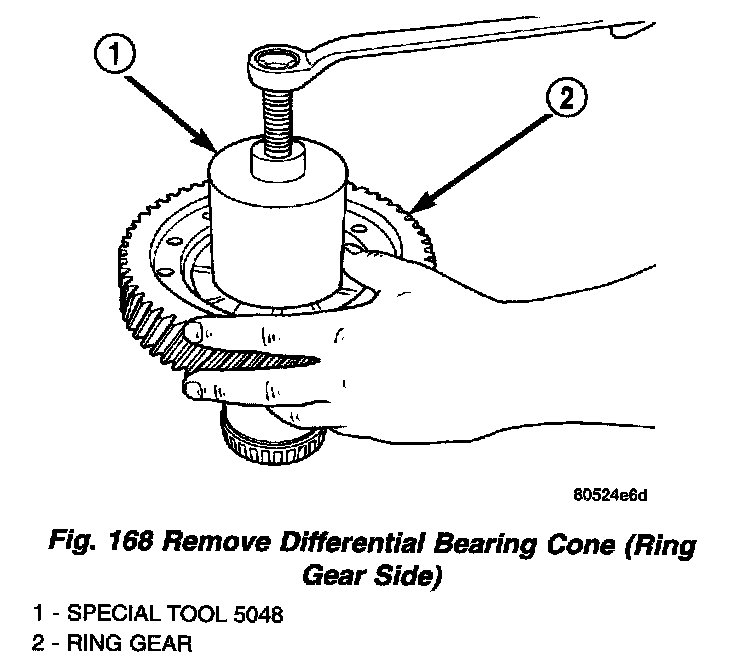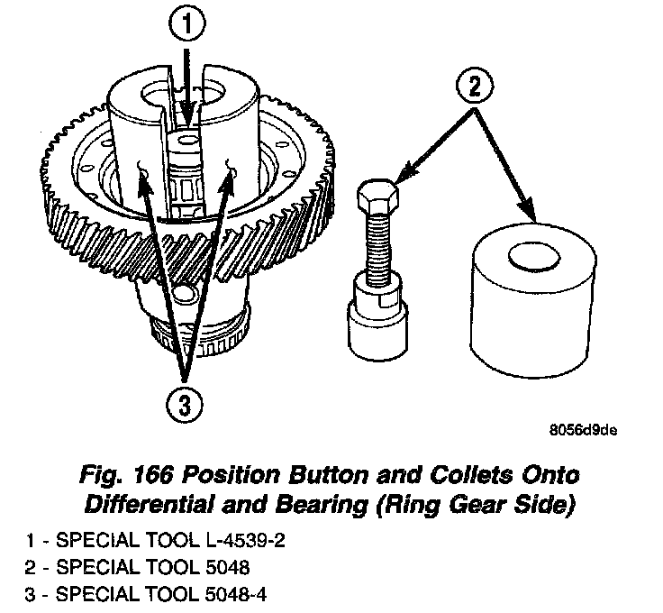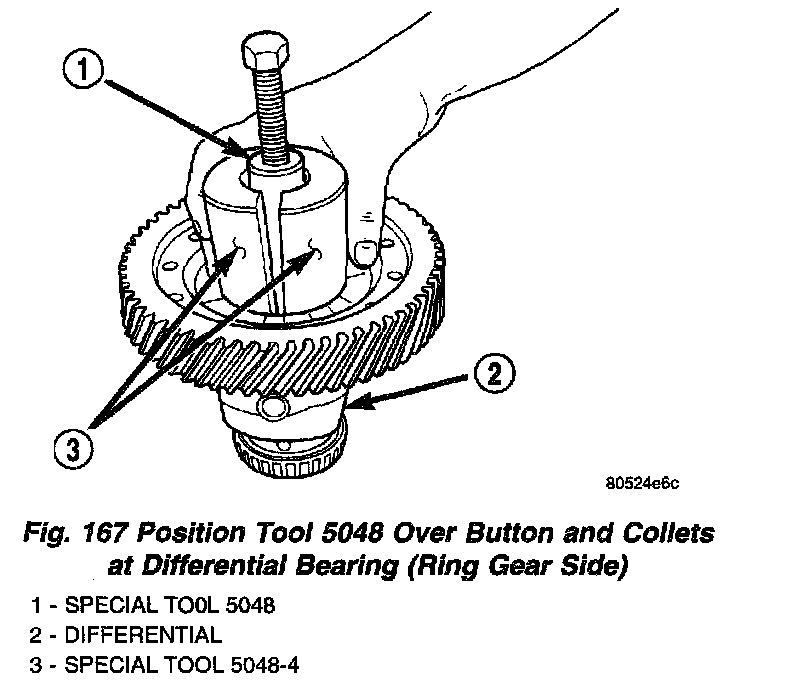 7. Use Miller Special Tool 5048, 5048-4 Collets, and L-4539-2 Button to remove the differential bearing cone on the bearing retainer side (Fig. 166) (Fig. 167) (Fig. 168).