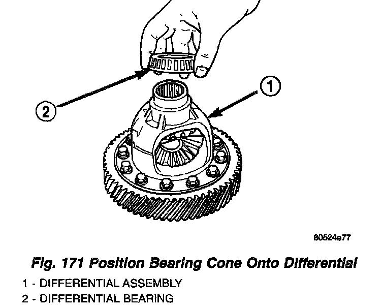 1. Using Miller Special Tool L-4410, and C-4171, install differential bearing to differential (extension housing side) (Fig. 171).