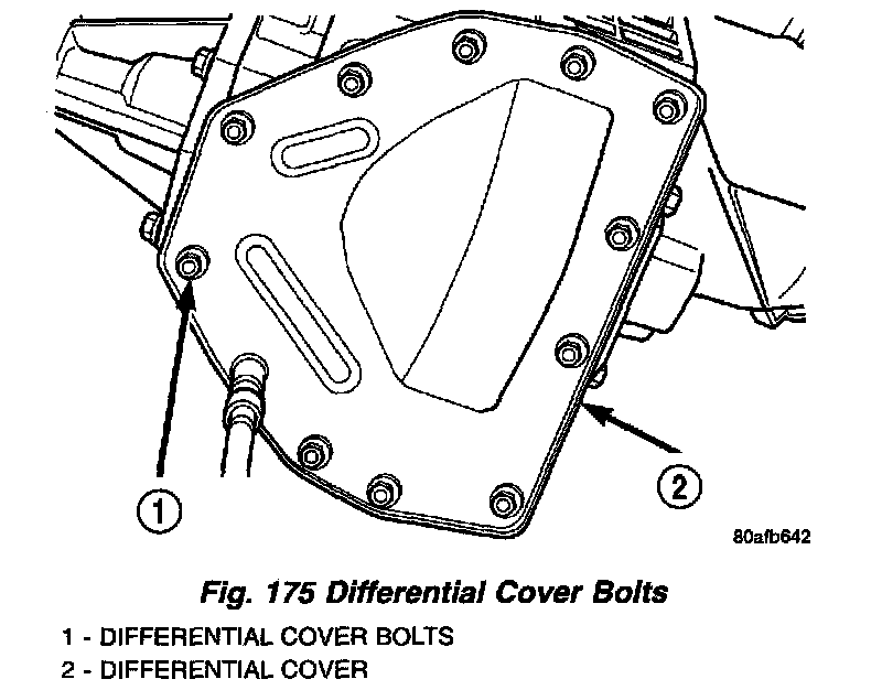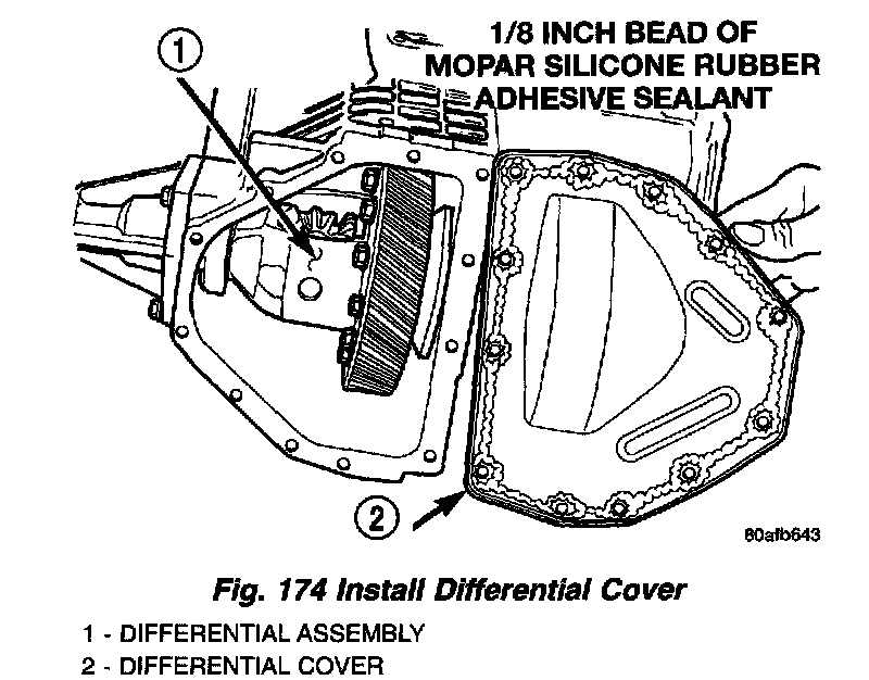 9. Install differential cover with a bead of Mopar Silicone Rubber Adhesive Sealant (Fig. 174) and torque bolts (Fig. 175) to 28 Nm (250 inch lbs.).
