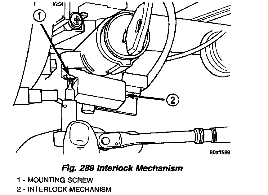 1. Position the interlock housing at steering column. Install the two interlock mechanism to steering column attaching screws (Fig. 289). Torque screws to 3 Nm (21 inch lbs.).