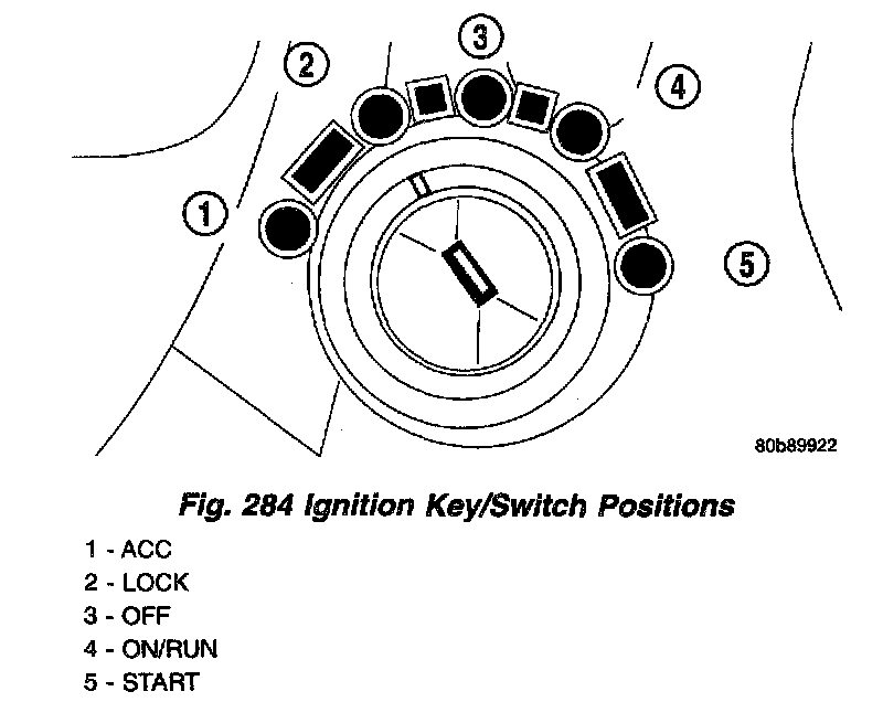 5. Place the shift lever in PARK. Move the Ignition key to the LOCK position (Fig. 284) and remove the key.