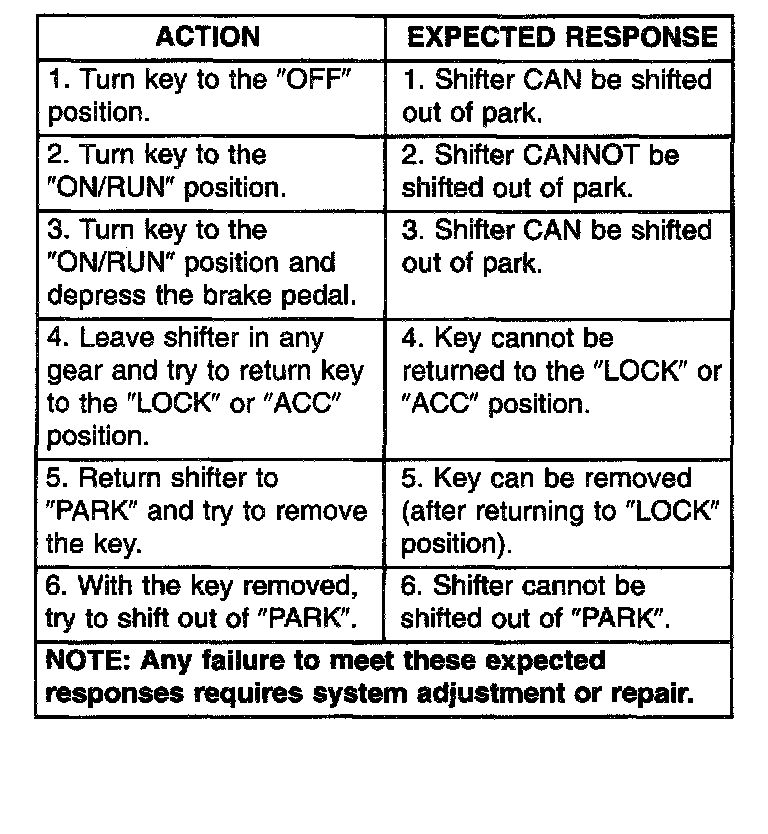 The following chart describes the normal operation of the Brake Transmission Shift Interlock (BTSI) system. If the "expected response" differs from the vehicle's response, then system repair and/or adjustment is necessary. Refer to the chart that expected shifter response, depending on ignition key/switch (Fig. 284) and brake pedal positions.