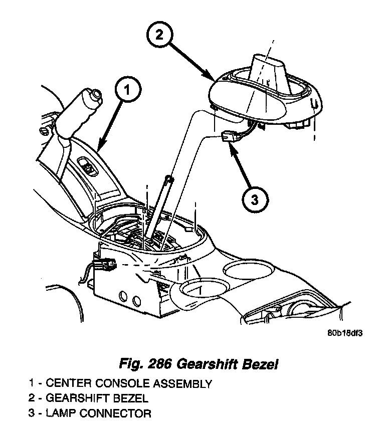 3. Remove the gearshift bezel to gain access to the interlock cable adjuster lock (Fig. 286).