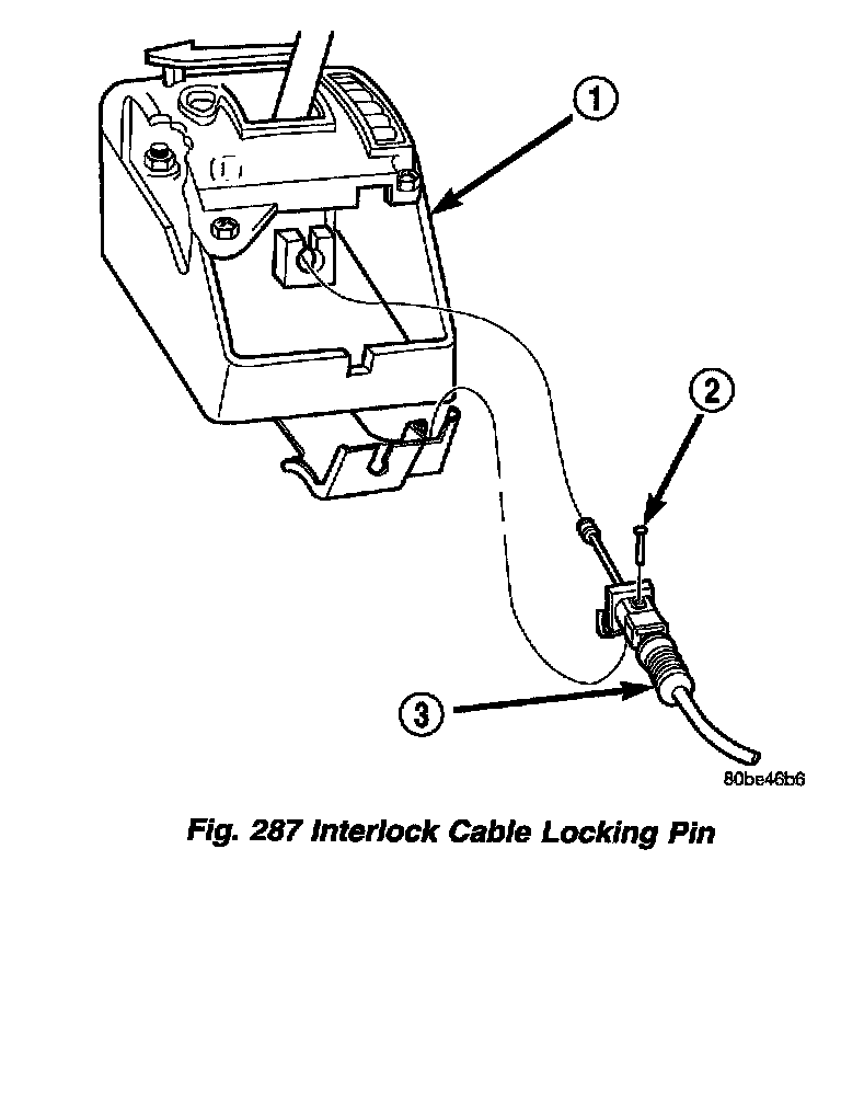 6. If the interlock cable is being replaced, remove the lock pin (Fig. 287). This will allow the cable to "self adjust" to the correct position. Tighten the locking clip by pushing it down (Fig. 288).