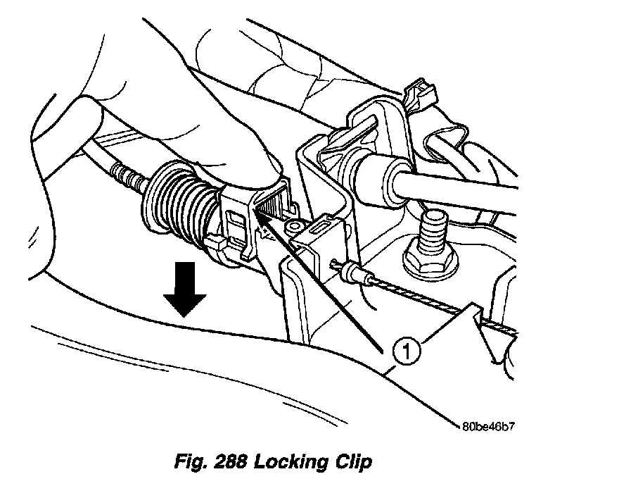 7. If the interlock cable is not being replaced, the lock pin will not exist. Pull outward on cable locking clip to allow cable to self adjust. Press clip down to lock in place (Fig. 288).