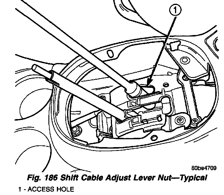 9. Loosen nut on shift cable adjust lever (Fig. 186).