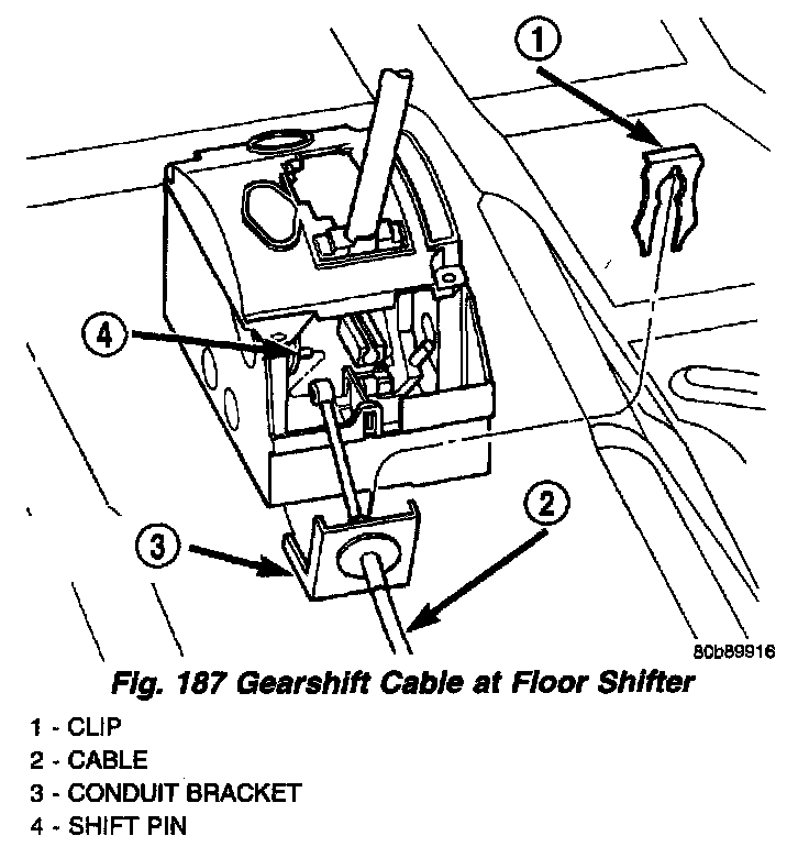 6. Connect cable to shifter conduit bracket and shift pin. Install cable retaining clip (Fig. 187).