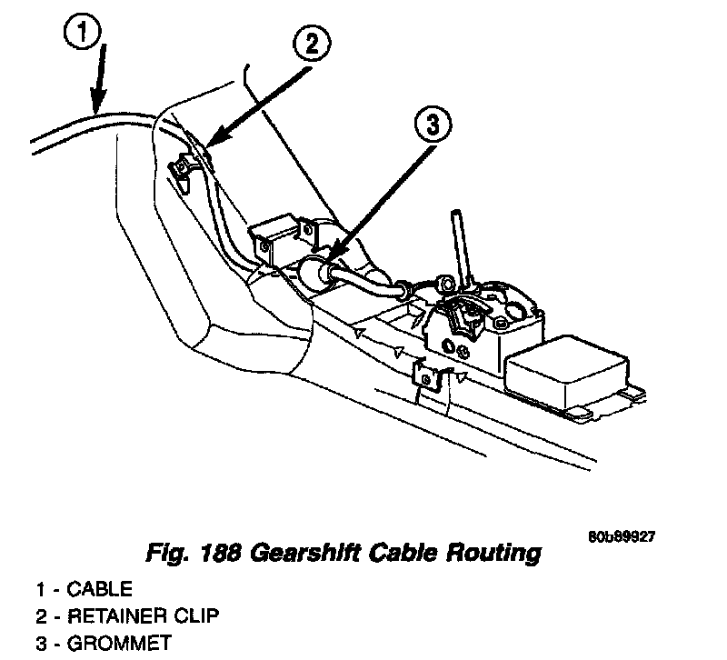 2. Position cable into retainer clip (Fig. 188) and tighten clip to secure cable. Route cable up towards transaxle shift lever.