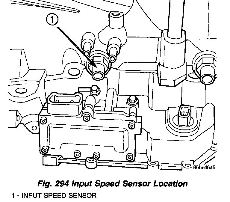 The Input Speed Sensor is a two-wire magnetic pickup device that generates AC signals as rotation occurs. It is threaded into the transaxle case (Fig. 294), sealed with an O-ring (Fig. 295), and is considered a primary input to the Transmission Control Module (TCM).