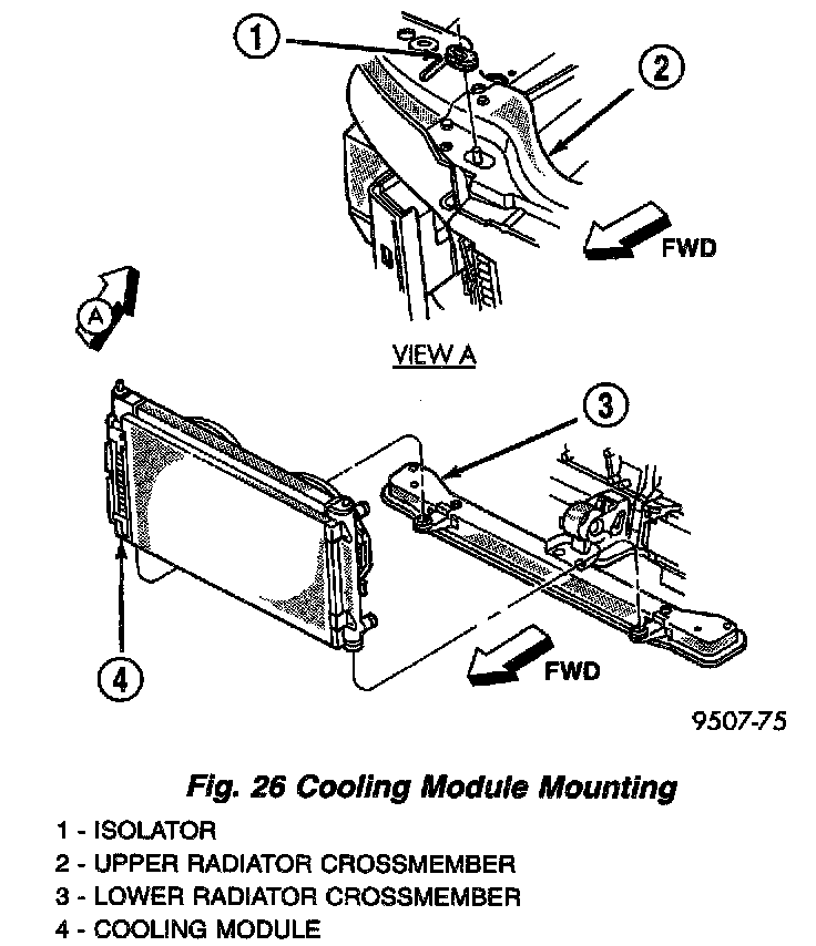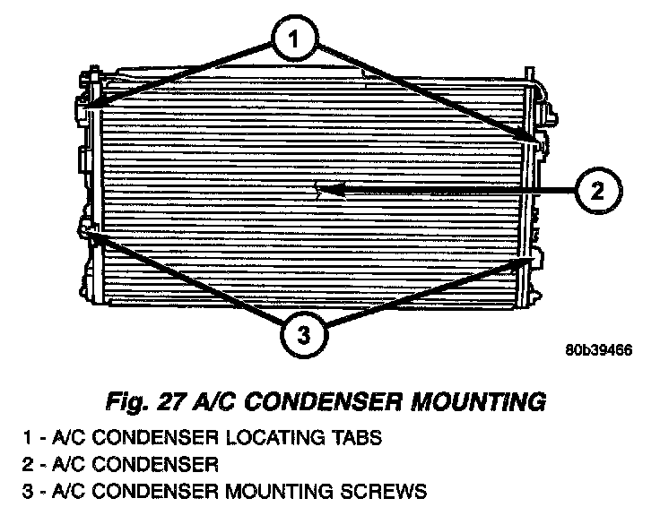 9. Remove the air conditioning condenser attaching screws located at the front of the radiator . Disengage AC condenser from radiator. It is not necessary to discharge the air conditioning system to remove radiator.