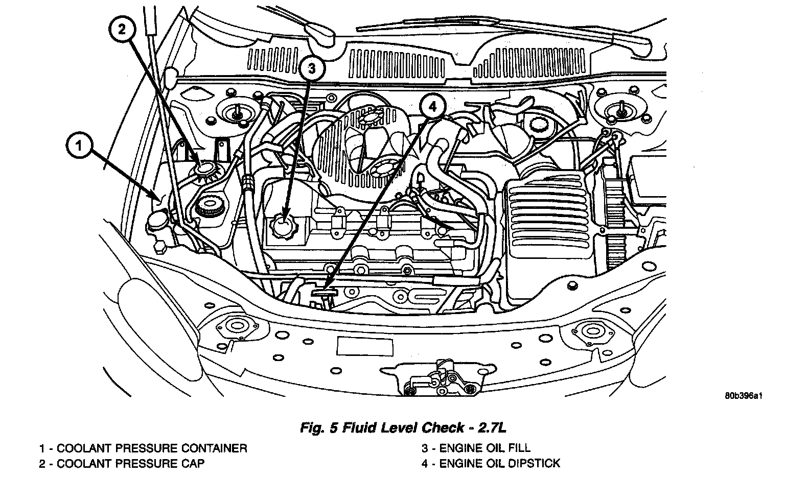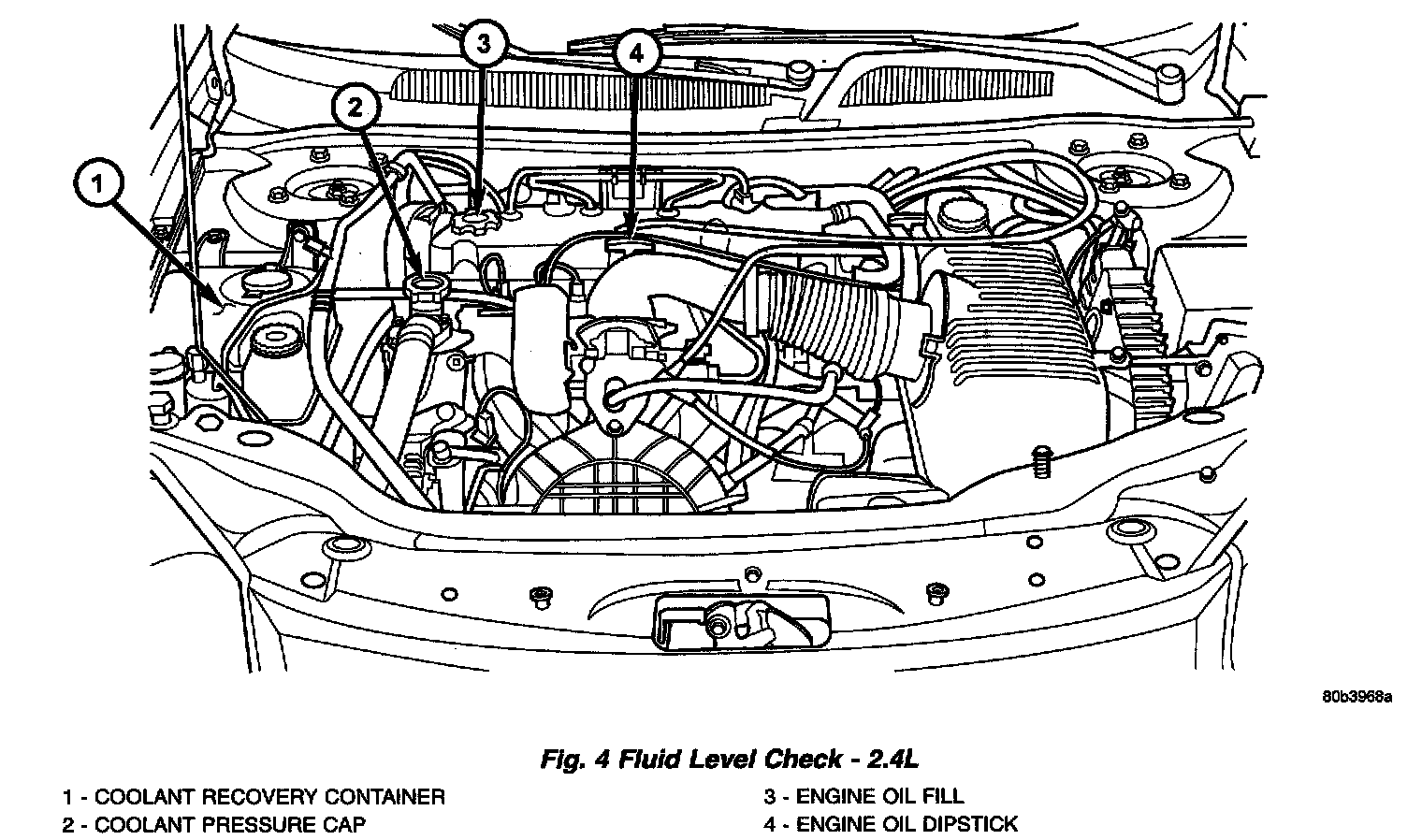 The coolant reserve system provides a quick visual method for determining the coolant level without removing the pressure cap. With the engine cold and not running, simply observe the level of the coolant in the coolant recovery container (2.4L) or the coolant pressure container (2.7L). The level should be between the MIN and MAX marks.