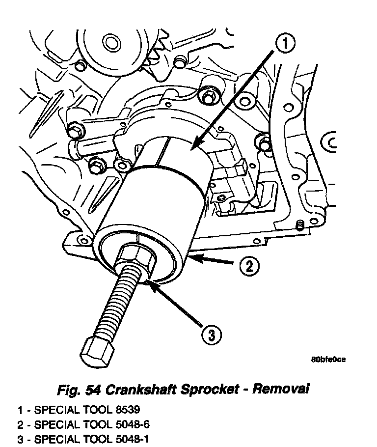 2. Remove crankshaft sprocket by first installing the crankshaft damper bolt. Apply grease or equivalent to damper bolt head and position Special TDO1S 5048-1, 5048-6, and 8539 on sprocket and crankshaft nose (Fig. 54). Remove sprocket using care not to rotate the crankshaft.
