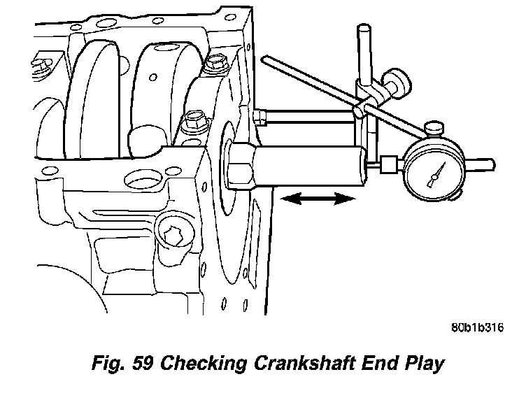 STANDARD PROCEDURE - CRANKSHAFT END PLAY1. Using Dial Indicator C-3339 and Mounting Post L-4438, attach to front of engine, locating probe perpendicular on nose of crankshaft (Fig. 59).