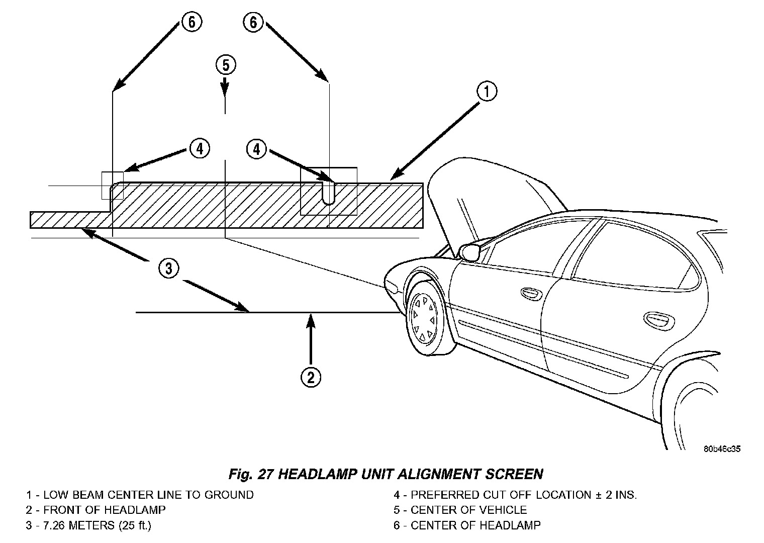 7. Measure distance from the center line of the vehicle to the center of the headlamp bulbs, or refer to the HEADLAMP UNIT ALIGNMENT MEASUREMENT TABLE . Transfer measurements to screen (with tape) to each side of vehicle center line. Use these lines for left/right adjustment reference (Fig.27).