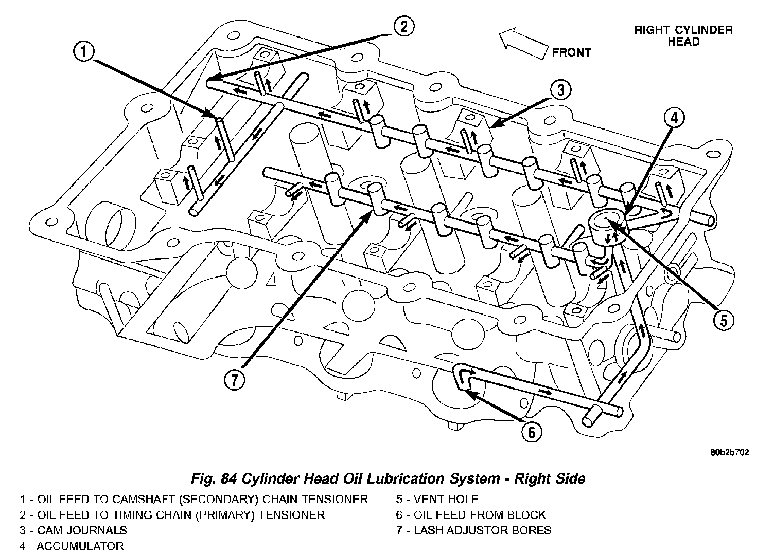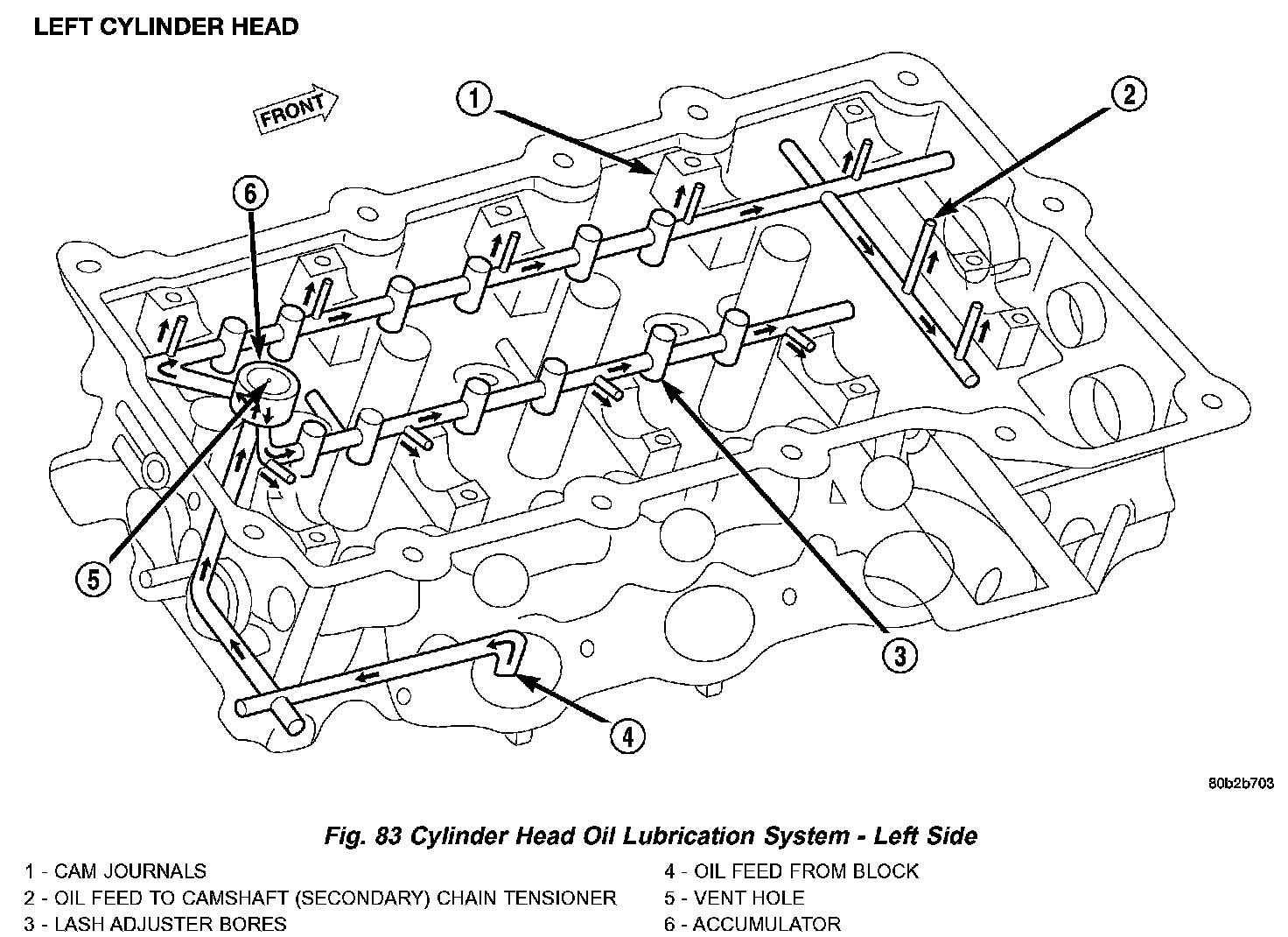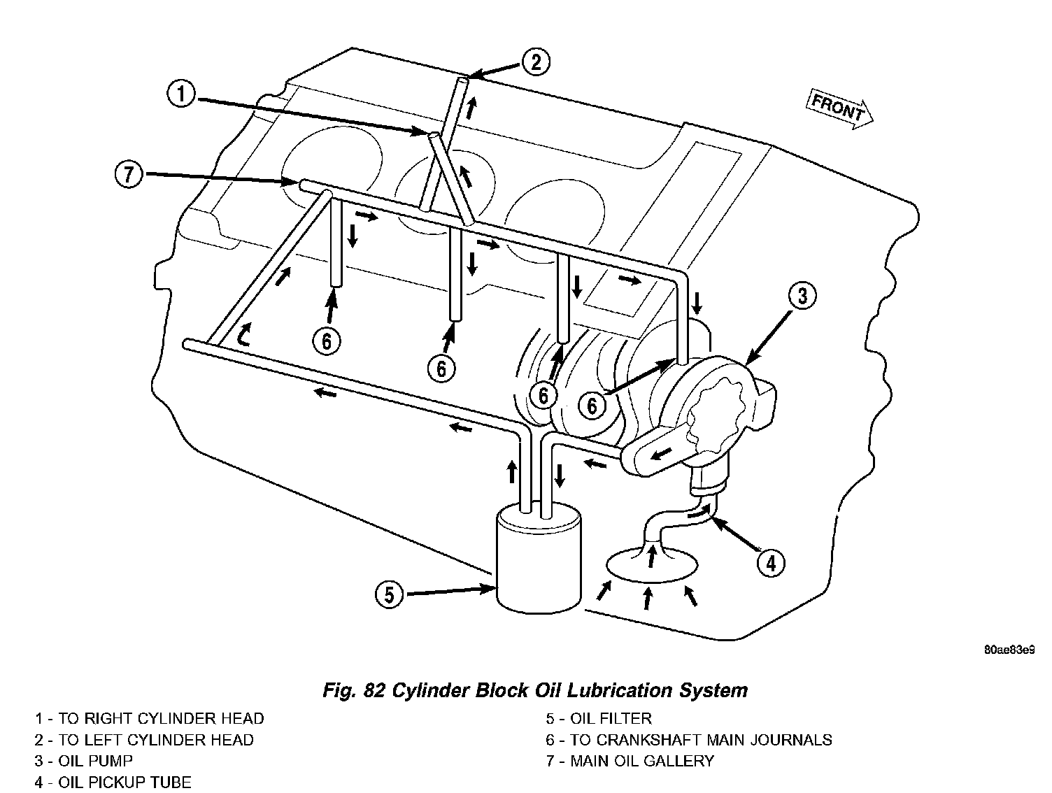 Oil from the oil pan is pumped by a geroter type oil pump directly coupled to the crankshaft (Fig. 82). Oil pressure is controlled by a relief valve mounted inside the oil pump housing. See (Fig. 82), (Fig. 83), and (Fig. 84) for engine oil lubrication circuits.