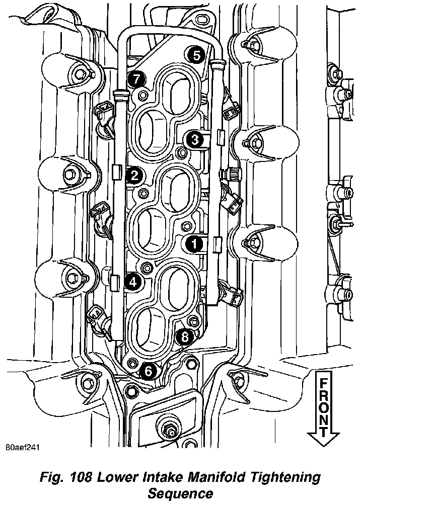 4. Install manifold attaching bolts and tighten in sequence shown in (Fig. 108) to 12 Nm (105 in. lbs.). Remove bolt used for aligning manifold.