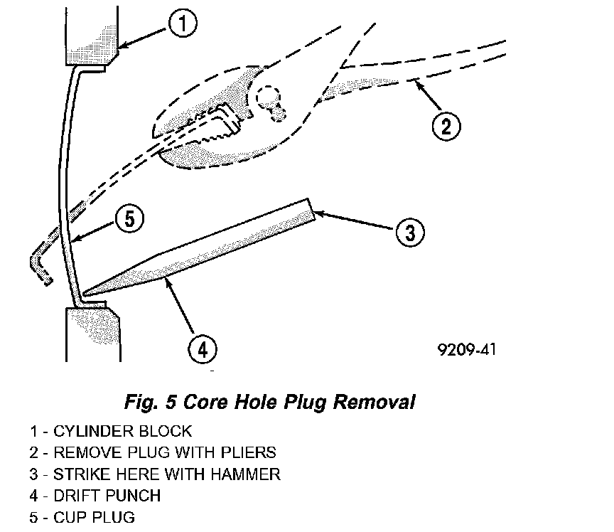 Using a blunt tool such as a drift and a hammer, strike the bottom edge of the cup plug. With the cup plug rotated, grasp firmly with pliers or other suitable tool and remove plug (Fig. 5).