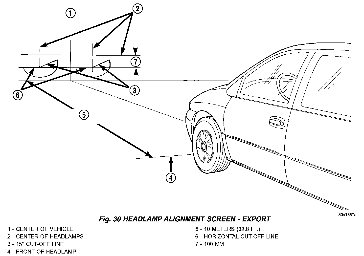 A properly aimed low beam headlamp will project a high intensity light pattern on the screen with the horizontal cut-off line aligned with the tape line 100 mm (4 in.) below the headlamp centerline (Fig. 30). The intersection of the horizontal and 15 degree cutoff lines in the projected pattern should align to the intersection of the headlamp centerline vertical tape line and the tape line 100 mm (4 in.) below the headlamp horizontal centerline.