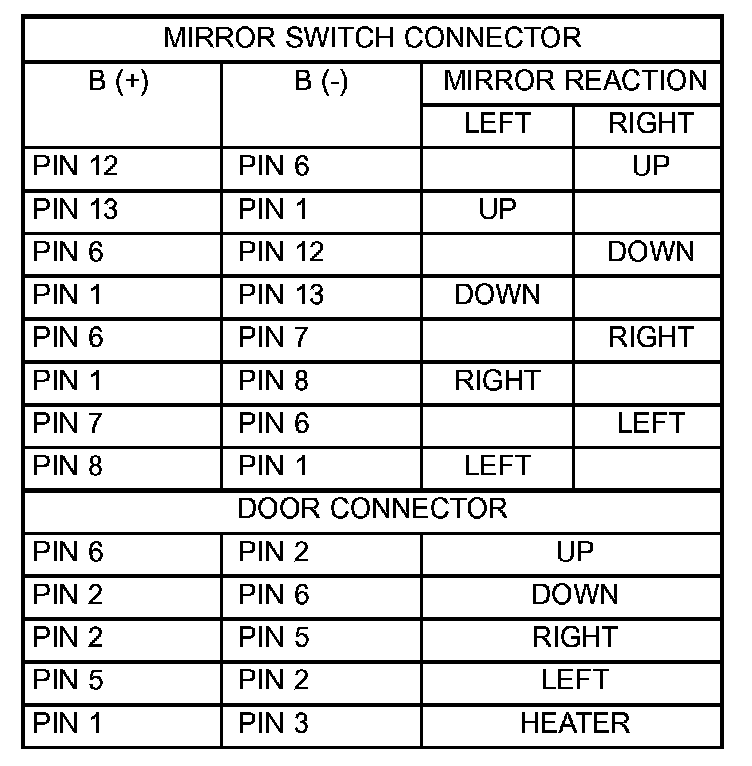 - Refer to the Mirror Motor Test Chart for proper wire connections at the switch connector
